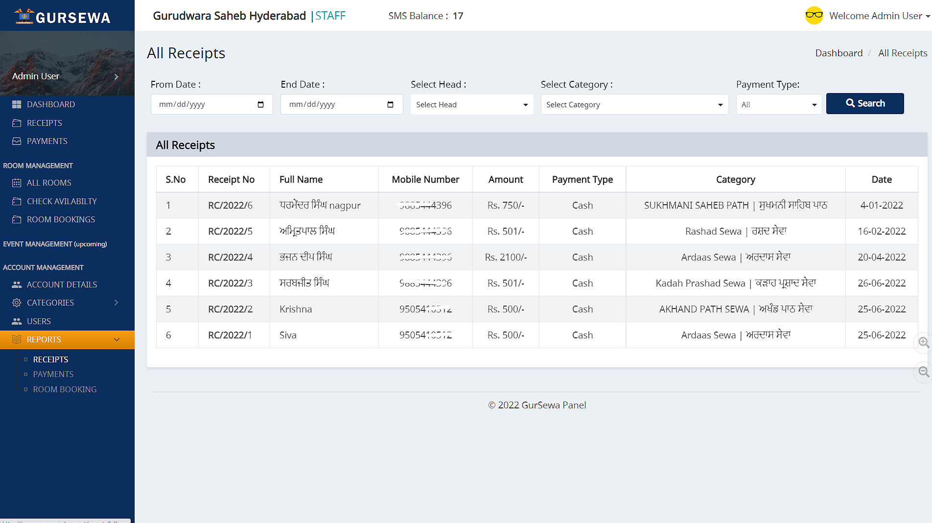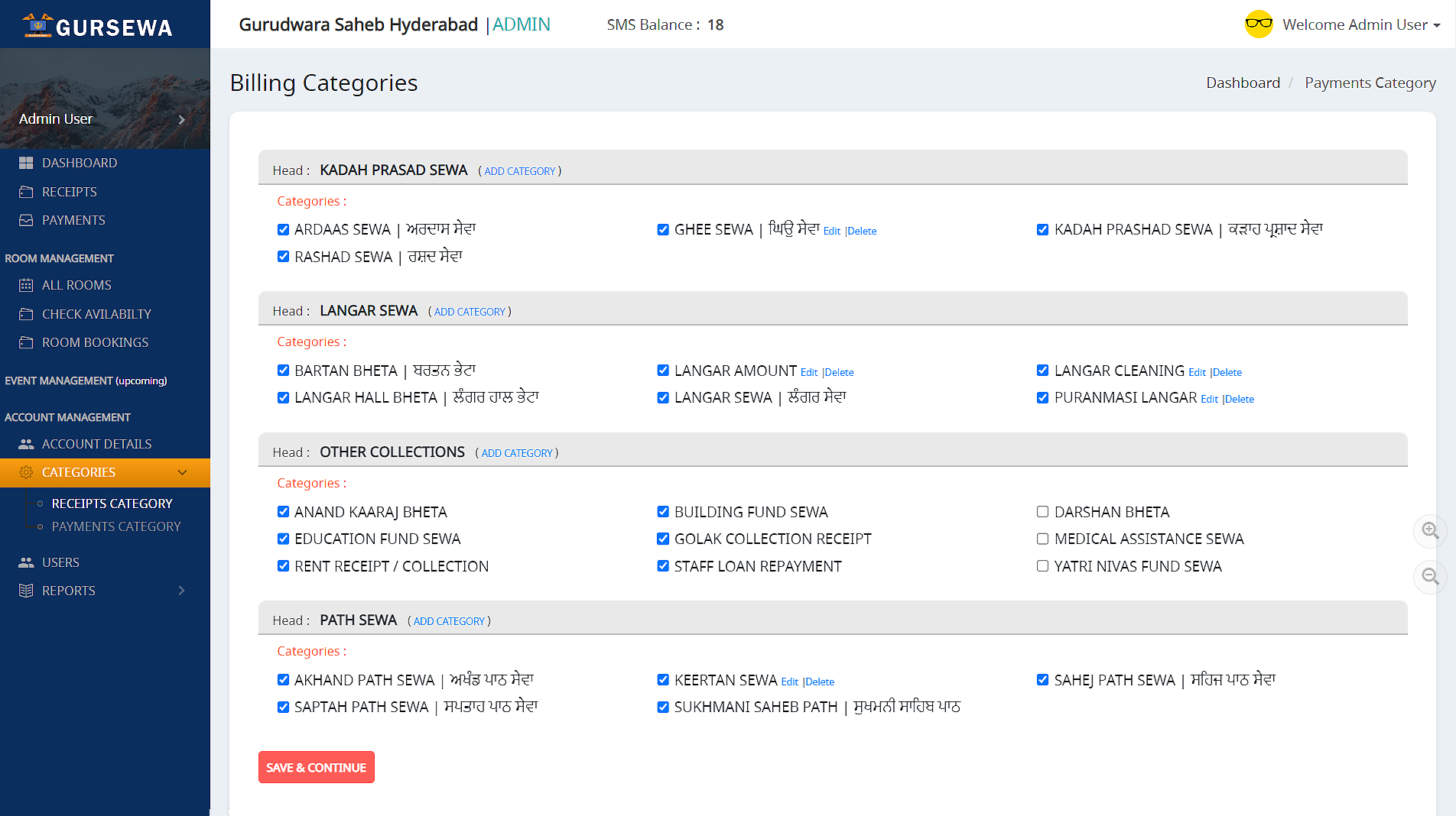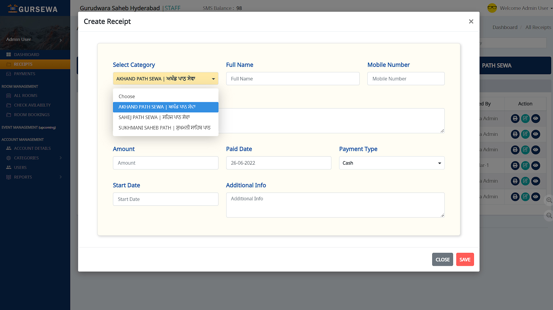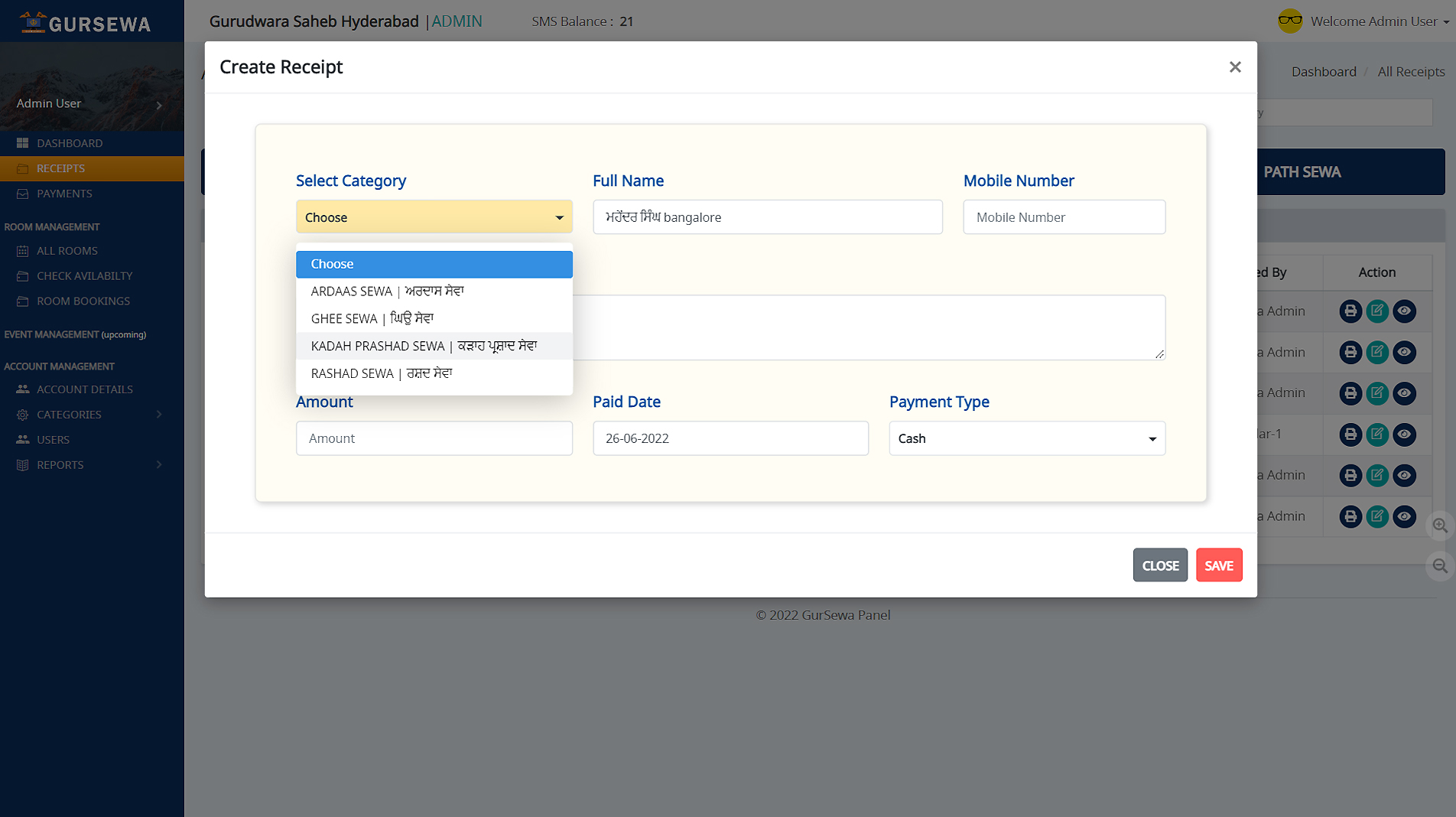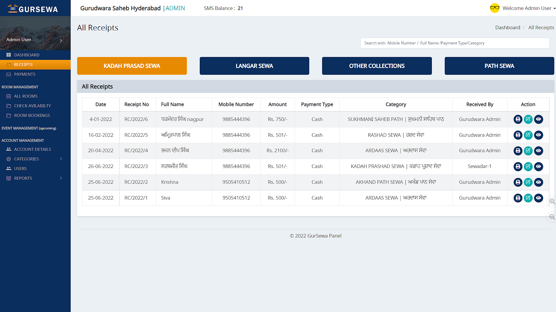 This module helps to collect and print daily donations towards Kadah Prashad, Ardaas, Langar Sewa, etc. Even bookings can be done for Akhand Path, Sahej Path, Sukhmani Saheb Path Sewas.