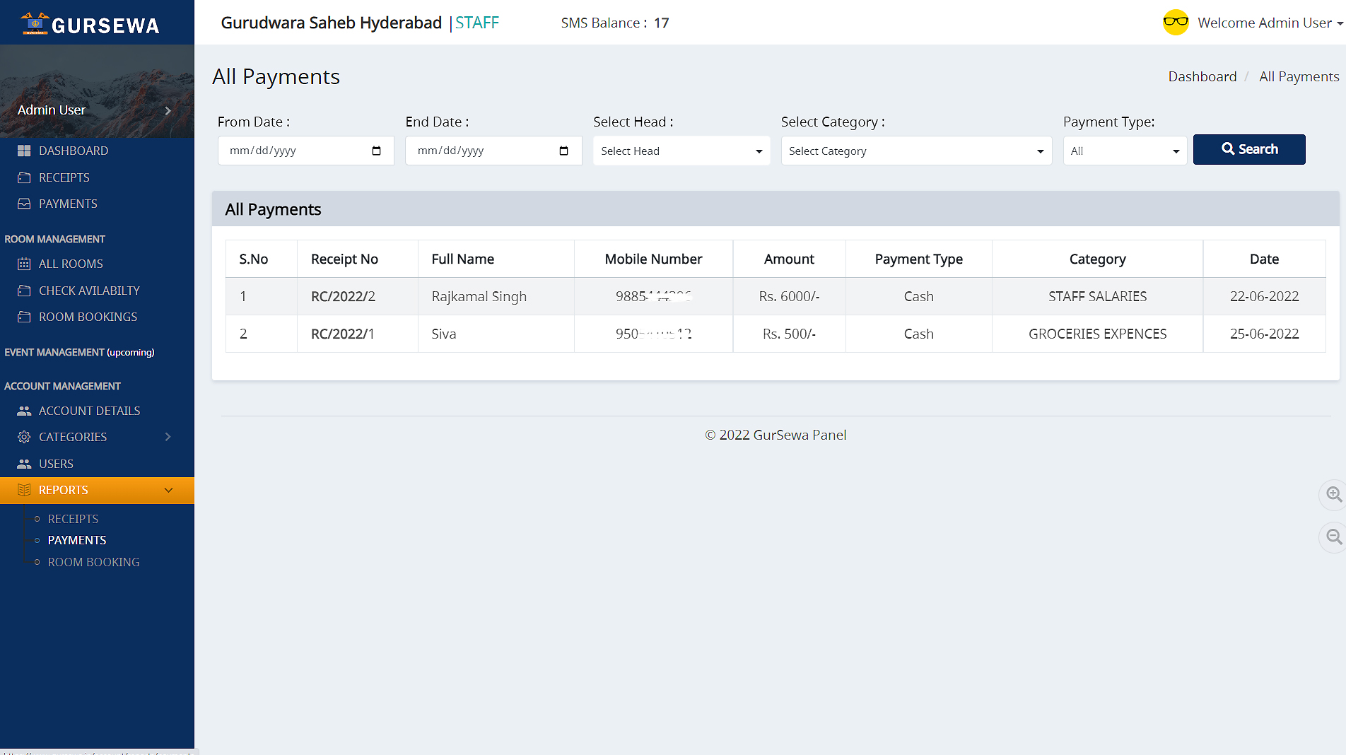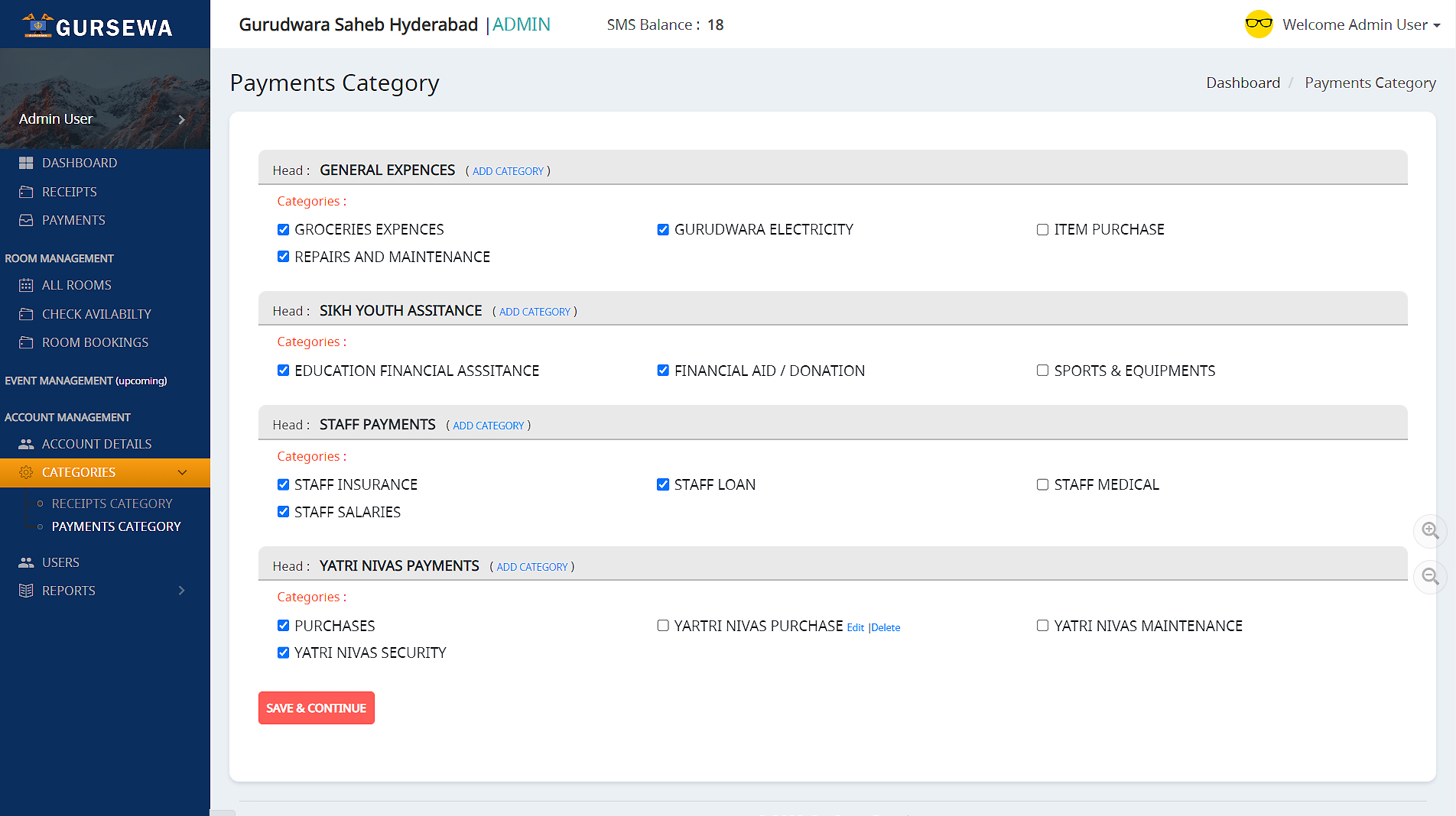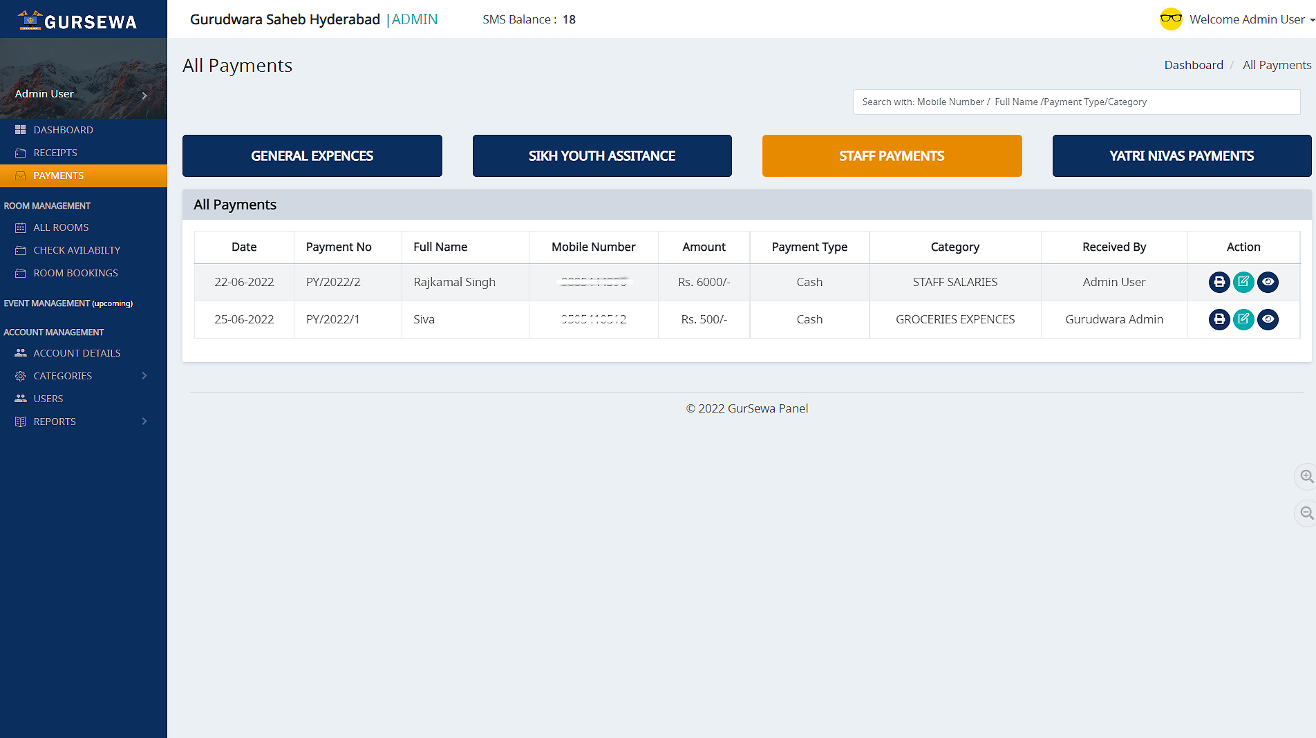 GURSEWA helps to overcome the problems faced in manual procedure of maintaining Receipts, Payments, Yatri-Nivas room bookings, Inventory, Donations received and payments, Reporting etc., under various accounting sections.