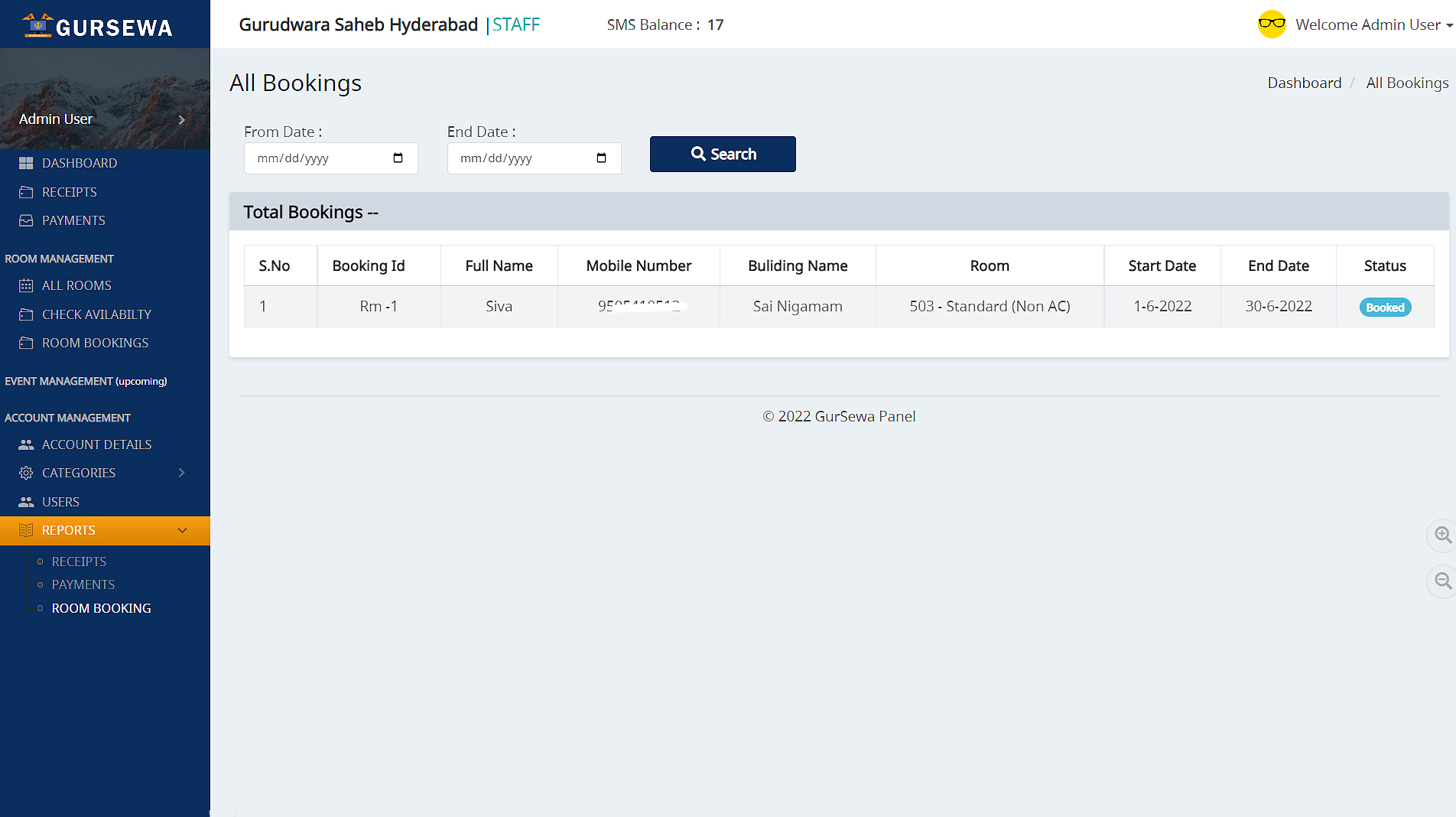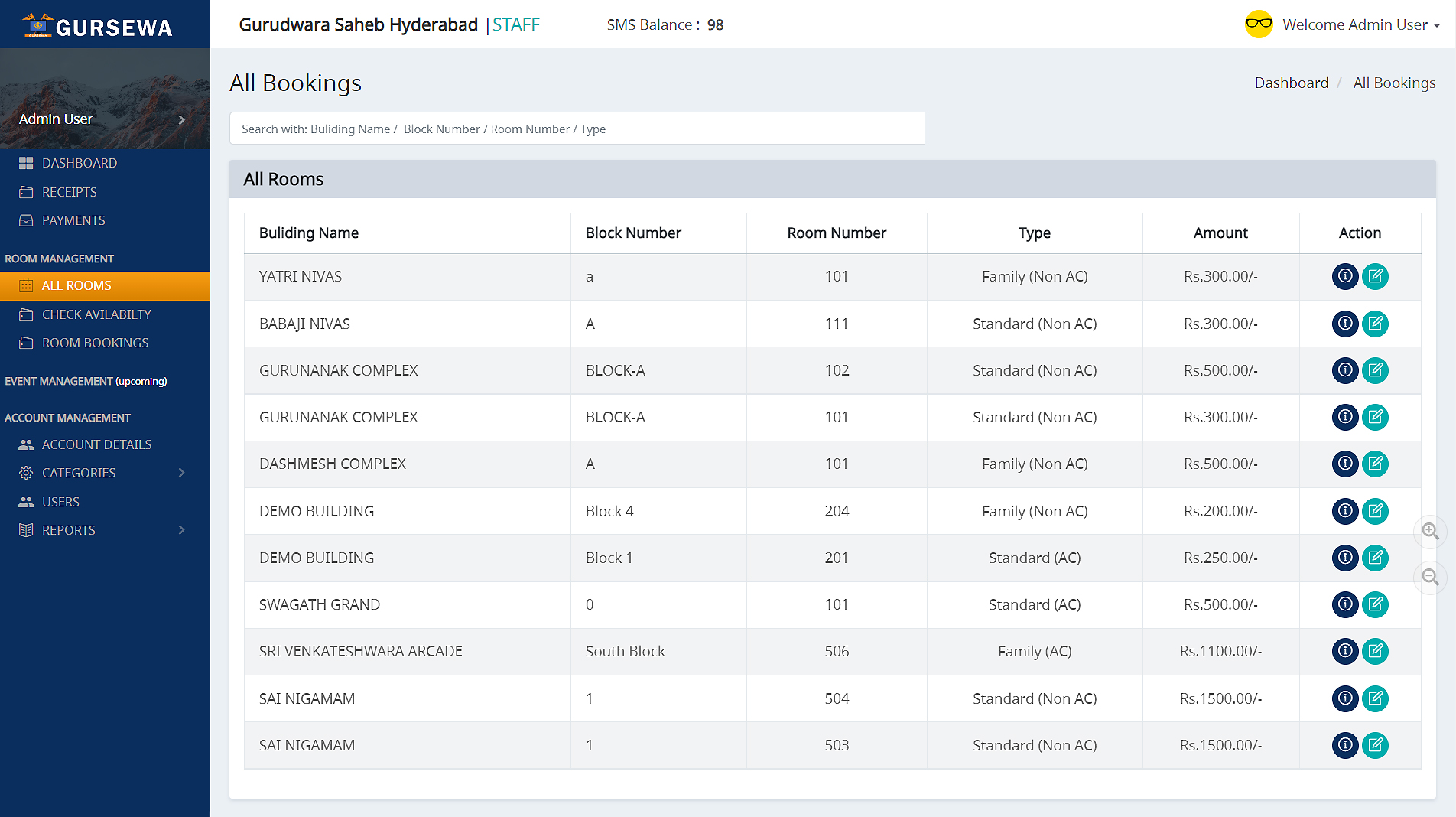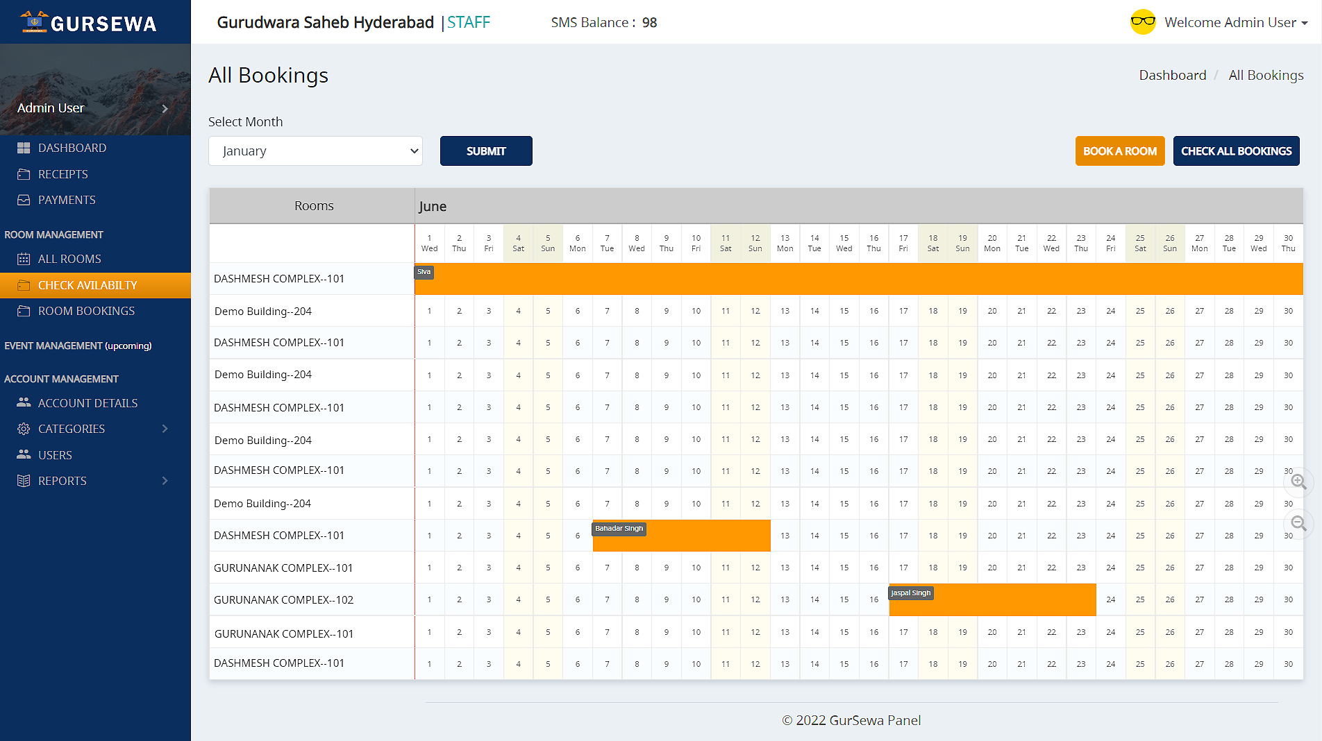 If Gurudwara has rooms for stay, this section helps the management to check the room availability and do bookings.