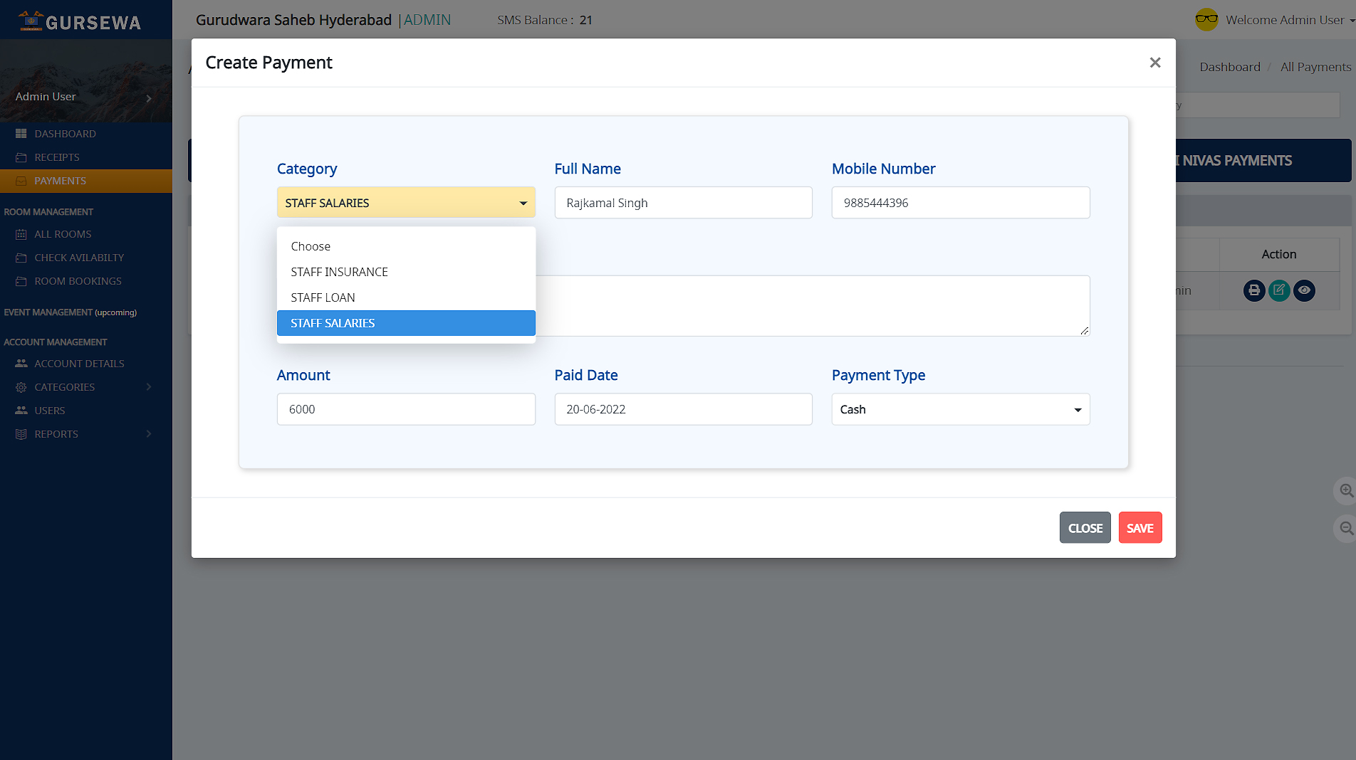 You can maintain Staff Salaries, Item Purchase, Repairs, Maintenance expenses, Education, Financial or Medical Assistance.